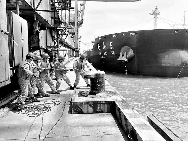 圖為煤輪“金海發(fā)”靠泊系纜作業(yè)現(xiàn)場(chǎng)。(陳旭山攝) “七月的風(fēng)懶懶的,連云都變熱熱的。”持續(xù)的高溫天氣讓人連走出空調(diào)房的勇氣都沒(méi)有,可肖厝港物流公司駐鴻山熱電項(xiàng)目部的一線作業(yè)人員卻要走出空調(diào)房,在太陽(yáng)下?lián)]汗如雨。在作業(yè)現(xiàn)場(chǎng),系纜作業(yè)人員總是早早穿好救生衣, 戴上防滑手套,做好各項(xiàng)準(zhǔn)備工作,只等船舶停靠碼頭后,協(xié)助船上人員共同拉動(dòng)船上纜繩系纜。重達(dá)幾萬(wàn)噸的船舶,至少需要系6根纜繩,每根纜繩都有成年人手臂粗細(xì)。烈日下的他們,配合默契地排成一列,用上所有力氣將纜繩緊緊拉住,黝黑的臉龐在陽(yáng)光的照射下隱隱閃著金光,身上的汗水不停地流淌。可別小看這個(gè)簡(jiǎn)單的操作,倘若纜繩系得不緊,遇到大風(fēng)天,船舶偏離碼頭,將嚴(yán)重影響卸船效率,危險(xiǎn)系數(shù)也大大增加。