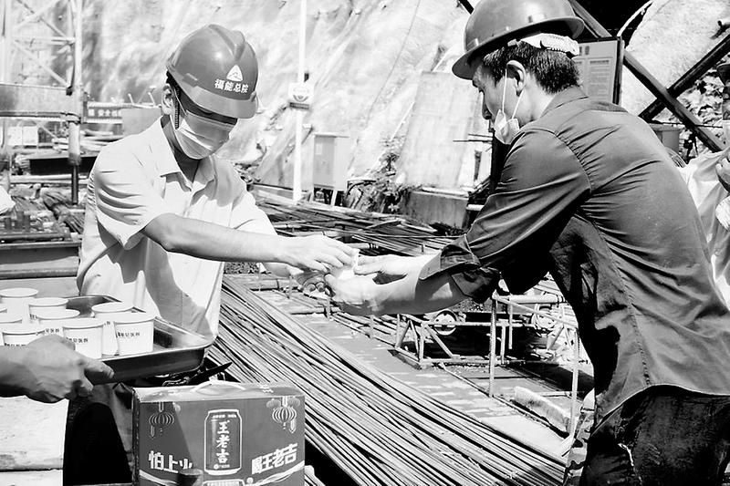 8月12日,福能總醫(yī)院工會(huì)及女工委聯(lián)合安全生產(chǎn)部門到二期附屬樓工程建設(shè)現(xiàn)場(chǎng),向在室外高溫環(huán)境下作業(yè)的工人們發(fā)放涼茶等消暑飲品,并叮囑工人們?cè)诟邷靥鞖庵幸⒁馐┕ぐ踩蜕眢w健康。(李嘉慧 陳藍(lán)天攝影報(bào)道)