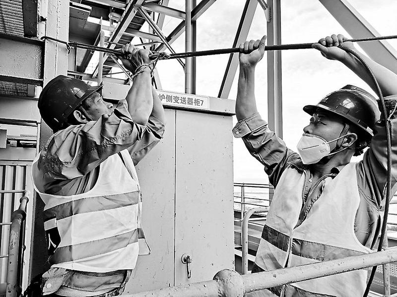 近日,鴻山熱電公司根據(jù)年度安措計(jì)劃,正在有條不紊地開展#1鍋爐鋼結(jié)構(gòu)整治工作。圖為施工人員正在烈日下進(jìn)行安全繩綁扎。(張偉明攝影報(bào)道)