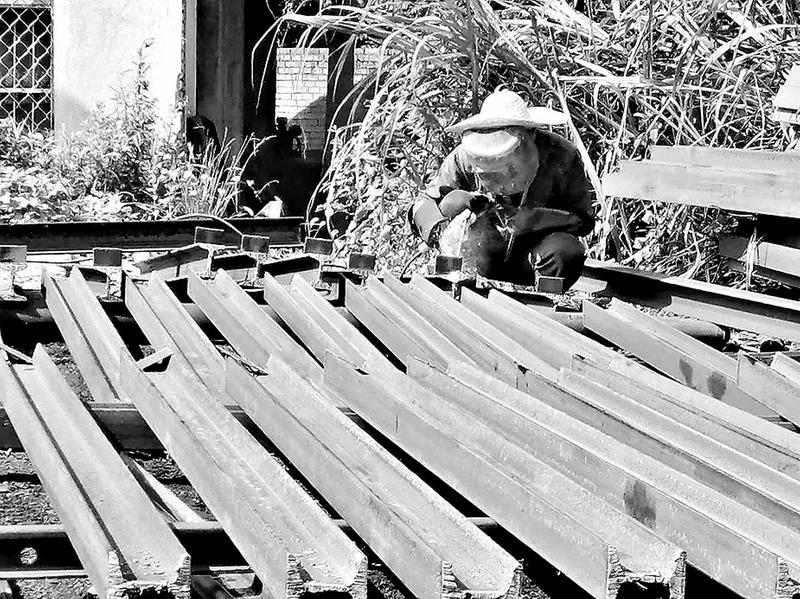 8月17日上午,立秋過后的天氣依然悶熱。福建煤電公司龍?zhí)兜V井口工業(yè)廣場(chǎng)的機(jī)修車間門口,電焊工老李正在焊接工字鋼。(陳思忠 攝影報(bào)道)