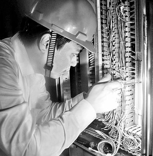 圖為曾赟在設(shè)備間接線。 “新的燃料小間就位了!