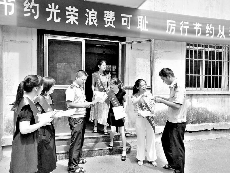 近日,永安煤業物業分公司黨支部開展“厲行節約、反對浪費”主題黨日活動,圖為志愿者在食堂門口向全體職工發放“厲行勤儉節約、反對鋪張浪費”倡議書。(蔡麗燕攝影報道)