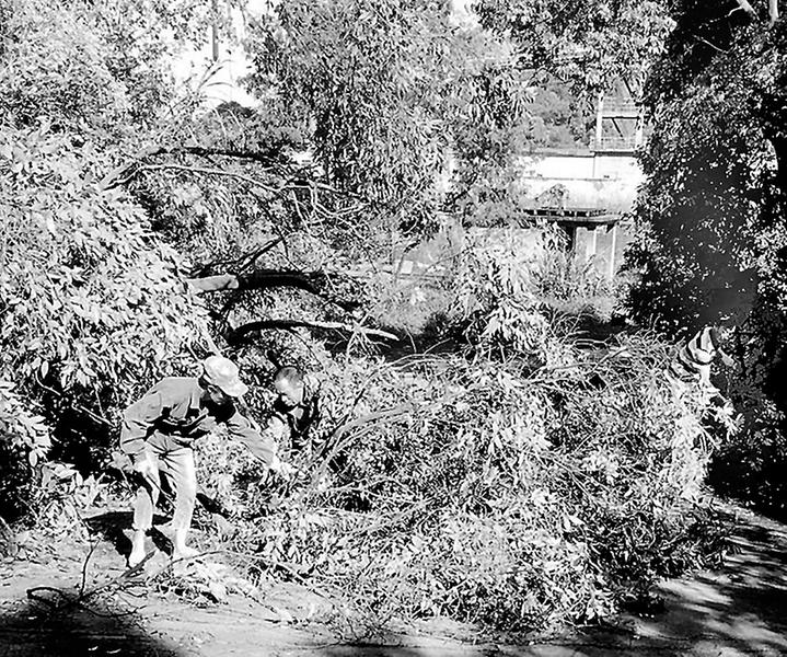 圖為賴木生等三人在清理路障現(xiàn)場。 八月的天氣說變就變。剛才還晴空萬里、艷陽高照,沒過一會(huì)兒就電閃雷鳴、狂風(fēng)大作,下起了瓢潑大雨。福建煤電坎市發(fā)運(yùn)站區(qū)域四處散落著枝葉,其中一棵年代久遠(yuǎn)的大樹,由于難以承受大風(fēng)大雨,應(yīng)聲倒下,橫在了路邊。不一會(huì),出現(xiàn)了一個(gè)熟悉的身影,他沒有高大挺拔的身板,但他的手臂強(qiáng)壯有力,只見他揮舞著大掃把熟練地清理起來。