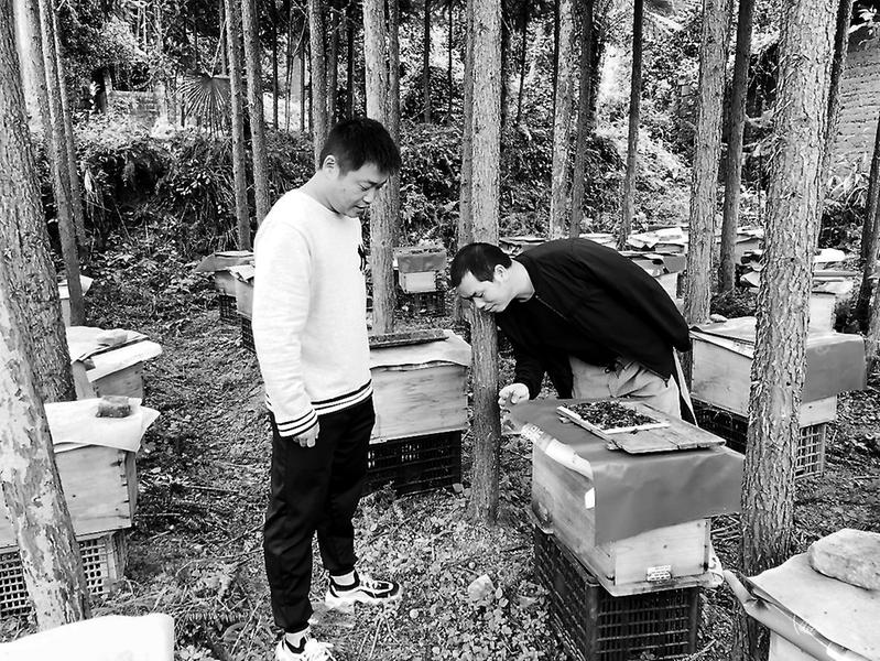 “孫書記是福能集團的干部,思路廣、辦法多、措施實,為我們村的脫貧攻堅出了大力!”村主任吳姚弟說。(郭賢權(quán))圖為孫濤(左)與方明在查看蜂箱