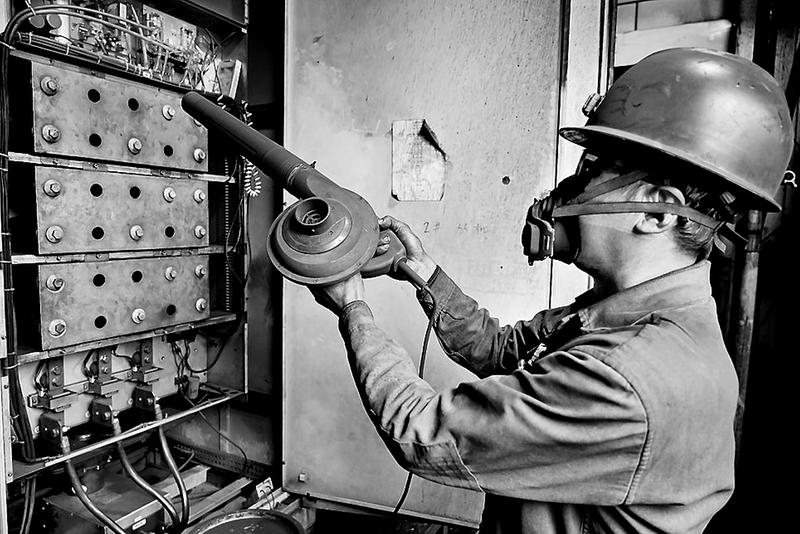 11月30日,在福建煤電公司龍?zhí)睹旱V月底檢修中,電工師傅老呂正在用專用吹風(fēng)機(jī)對(duì)煤臺(tái)皮帶機(jī)變頻器內(nèi)電子元器件進(jìn)行除塵。(陳思忠 攝影報(bào)道)