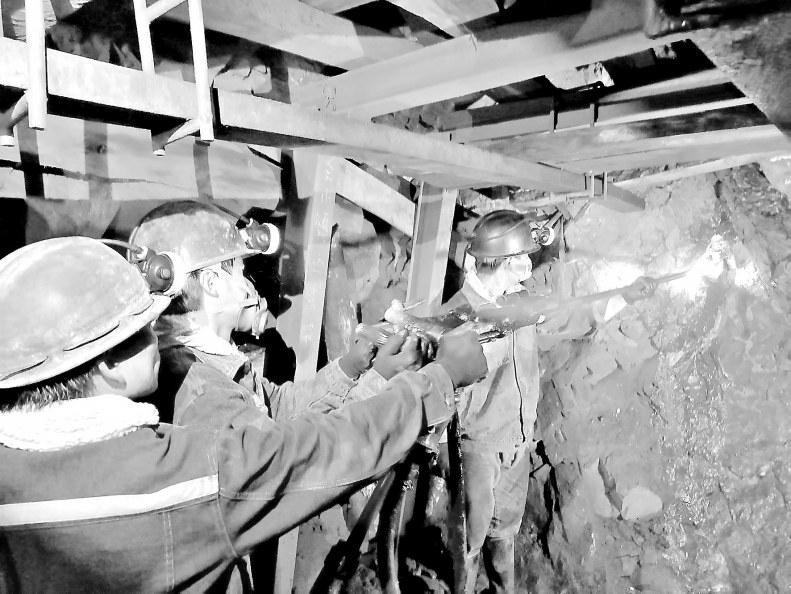 從左至右,鄧瑞榮、朱啟珍、湯炳德在掘進(jìn)面作業(yè)。