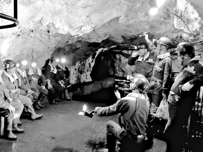 攝制組在井下拍攝礦工等待乘坐猴車聊天的鏡頭。