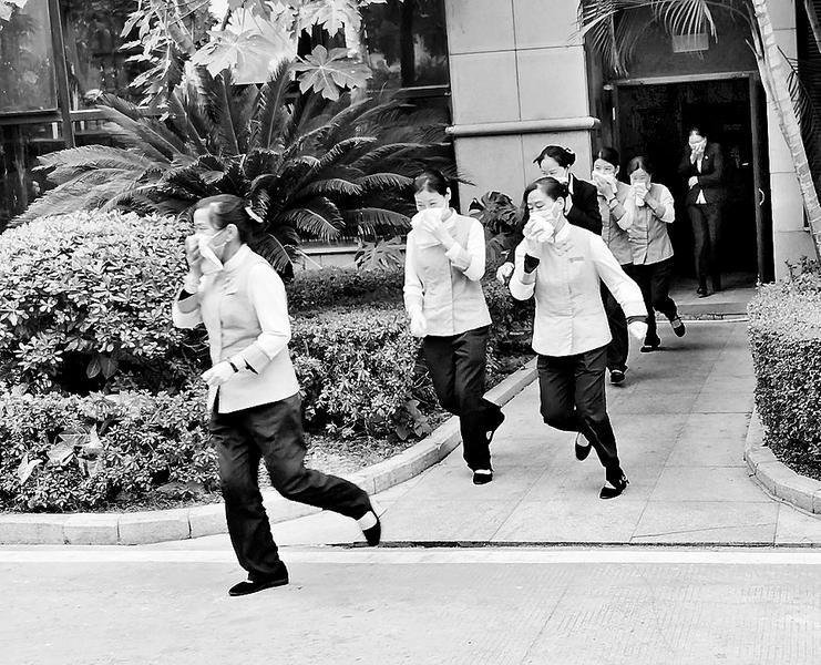 12月7日,寧德美倫大飯店組織職工和外包場(chǎng)所人員共49人開(kāi)展消防應(yīng)急演練和滅火器實(shí)操訓(xùn)練。圖為火災(zāi)逃生演練現(xiàn)場(chǎng)。(慶芬 興達(dá) 攝影報(bào)道)