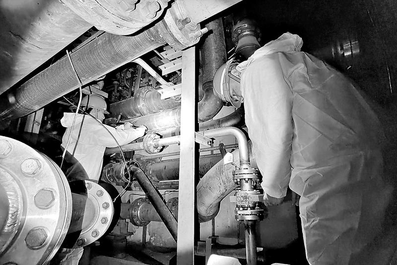 1月3日,晉江氣電公司完成4號(hào)機(jī)壓氣機(jī)離線水洗工作。該公司結(jié)合電網(wǎng)運(yùn)行實(shí)際,跟蹤壓氣機(jī)狀態(tài),調(diào)整發(fā)電機(jī)組熱備用時(shí)間,在確保完成“迎峰度冬”任務(wù)的前提下,合理安排4號(hào)機(jī)壓氣機(jī)離線水洗工作。離線水洗后,燃機(jī)效能有所提升,同等運(yùn)行工況下可多帶負(fù)荷約6MW。圖為該公司運(yùn)行人員正在執(zhí)行離線水洗安全措施。