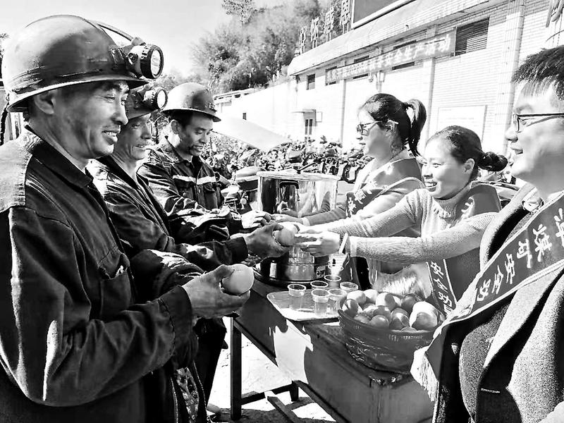 1月2日,福建煤電公司龍?zhí)睹旱V女工委組織青年志愿者和協(xié)管員帶著姜茶以及代表平安吉祥的蘋果和橘子,在井口為上下班的職工們送上新年祝福和安全囑托。