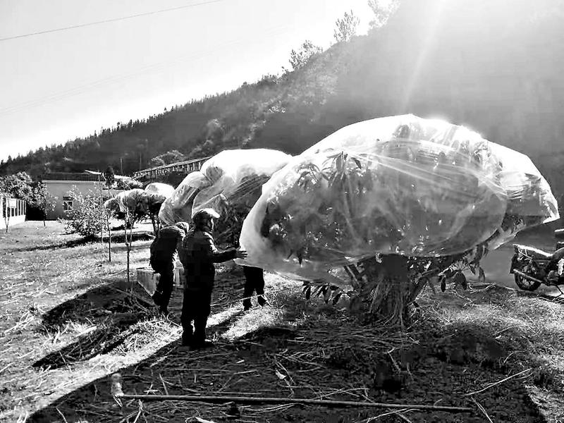 寒潮來襲,天湖山能源公司含春煤礦及時對礦區樹木花卉進行防寒防凍保護。圖為1月11日,該公司黨政辦組織人員頂著寒風,為樹木加蓋塑料膜。(姚文華 攝影報道)