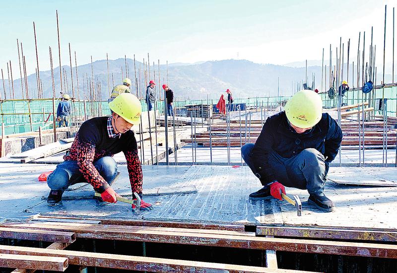 新年伊始,聯美公司龍巖美倫·生態城項目建設紅火,工人們克服寒冷天氣給施工造成的不利影響,全力以赴貫徹落實福能集團一季度工作部署,確保一季度生產經營“開門紅”。圖為1月18日施工人員正在進行12#樓屋面板安裝作業。