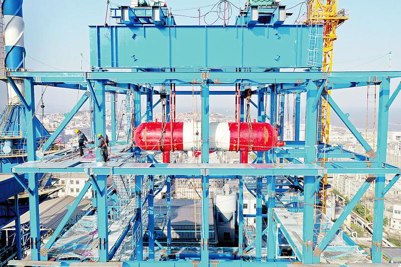 1月18日,石獅熱電公司1號鍋爐汽包順利吊裝就位,標志著該公司綜合節能減排改造工程1號鍋爐建設工作從土建、鋼架吊裝轉入設備安裝階段。圖為1號鍋爐汽包吊裝現場。(王逸群 攝影報道)