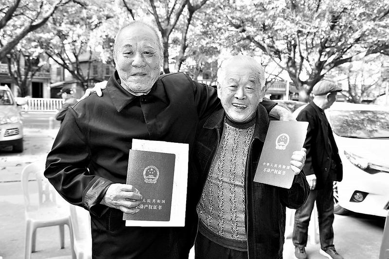曾擔任虎坑山副礦長的陳錫鵬樂呵呵地邀請老鄰居陳倫加一起合影,老哥倆手捧“紅房本”喜笑顏開。