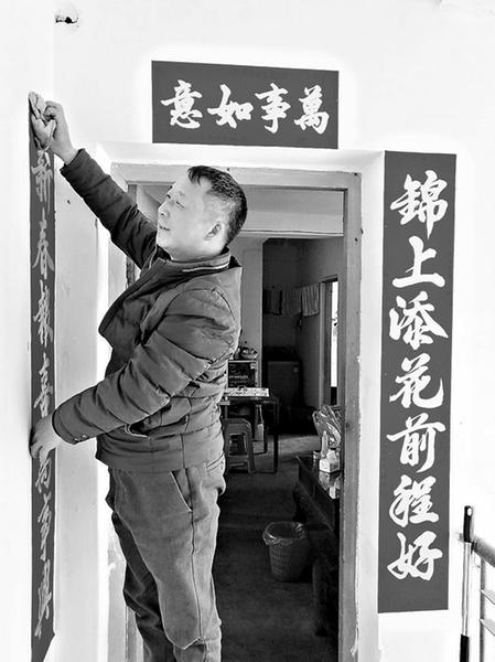 福建煤電公司龍?zhí)睹旱V職工積極響應(yīng)“就地過年”的號召,有近八成外地籍職工決定留礦過年。圖為2月2日,老家在云南省昆明市的采煤隊工人鄭興剛在礦區(qū)家門口貼春聯(lián)。