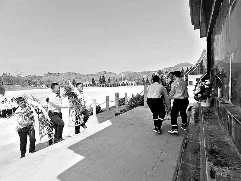 3月31日,福能貴電公司團委組織團員青年赴六枝特區牛場鄉烈士陵園開展“學黨史緬懷革命先烈、尋足跡砥礪前行”清明祭掃主題團日活動。圖為團員青年向革命烈士紀念碑敬獻花籃。(申鶴 攝影報道)