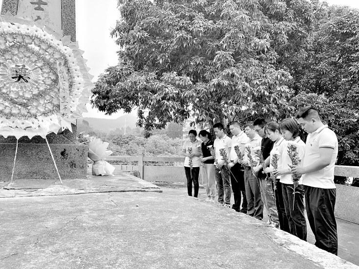 土公司黨支部在郭坑鎮烈士陵園開展“學黨史,祭英烈,傳承愛國情懷”主題祭掃活動。圖為全體黨員面對革命烈士紀念碑默哀行禮并敬獻鮮花。(韓輝 攝影報道)