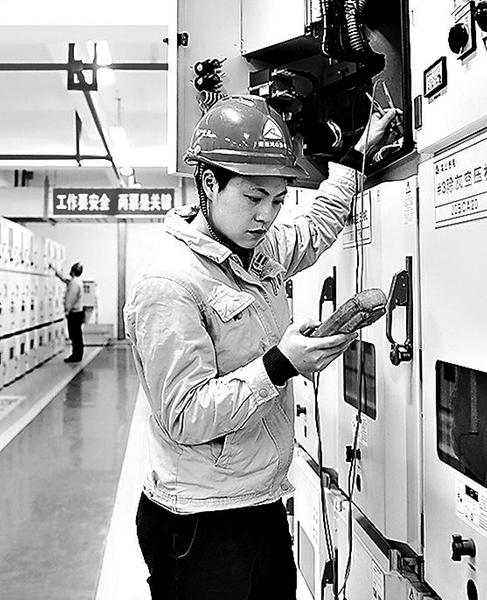 圖為陳梅在對開關柜進行檢查工作。