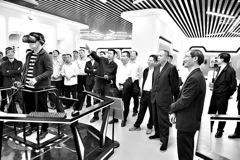 圖為集團副總經(jīng)理周必信(右三)正在觀摩VR事故體驗。