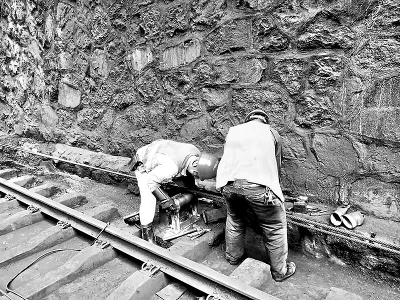 因受長期風(fēng)吹日曬雨淋的影響,加上火車線路上煤粉的腐蝕,福建煤電公司雁石發(fā)運(yùn)站絞車鋼絲繩下面的部分地滾架已老壞破損。圖為5月7日,該站組織人員更換地滾架。(朱德月陳群松攝影報(bào)道)