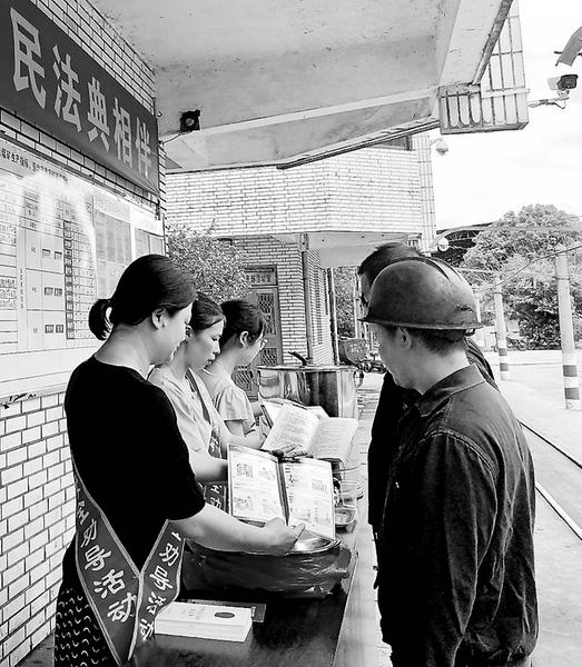 5月21日,福建煤電公司龍?zhí)睹旱V以“送清涼”為契機(jī),在民法典頒布一周年之際,組織協(xié)管員向職工宣傳民法典。(林莉 攝影報(bào)道)
