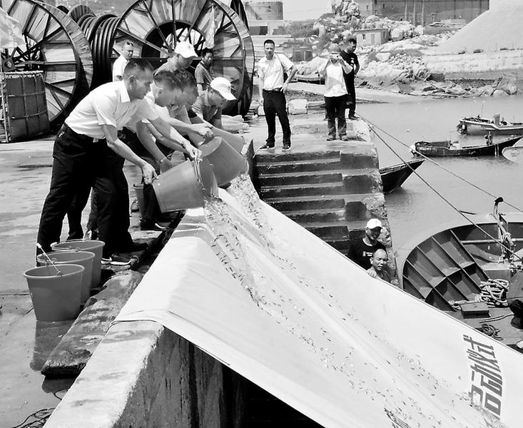 6月3日,三川海上風(fēng)電公司開展以“保護(hù)海洋生態(tài)建設(shè)優(yōu)美海電”為主題的生態(tài)補(bǔ)償增殖放流活動(dòng),本次投放的魚苗為周邊海域主要經(jīng)濟(jì)魚種,主要有鱸魚、黃姑魚、黃鰭鯛,總共計(jì)投放魚苗1600余萬(wàn)尾。(吳敏 涂俊偉 攝影報(bào)道)