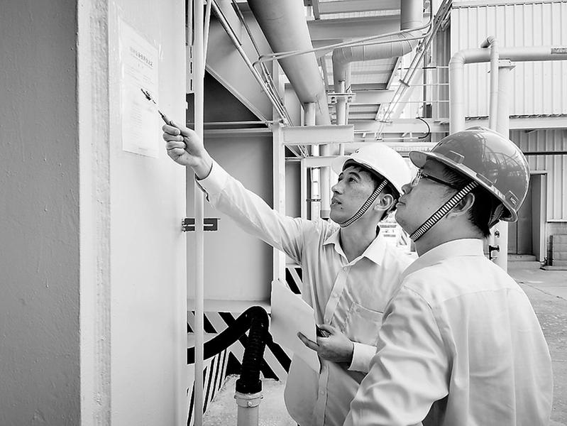 晉江氣電公司在“安全生產月”中開展隱患整改“回頭看”檢查活動。圖為6月11日,安監人員在現場檢查鍋爐張貼特種設備使用登記證情況。(張陽攝影報道)