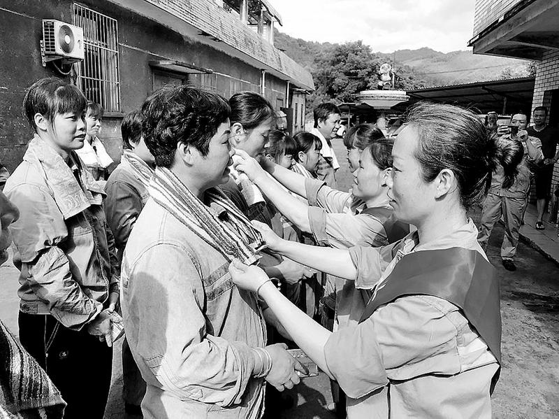 永安煤業(yè)公司加福篩選廠在安全生產月中,發(fā)揮女工安全協(xié)管優(yōu)勢,入車間、進班組送清涼、囑安全。圖為6月16日,該廠女工協(xié)管員正為生產一線員工掛上汗巾,并叮囑工友按章作業(yè)。