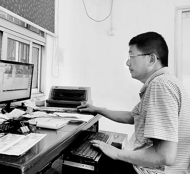 (韓艷攝影報(bào)道)圖為黃建明在地磅房工作。”