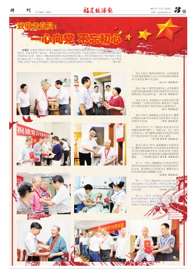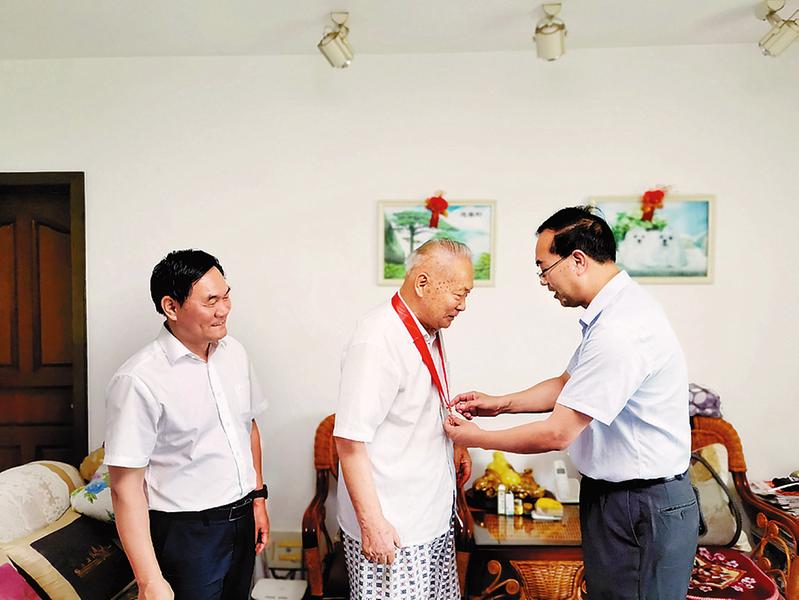 ①6月28日,集團(tuán)黨委副書(shū)記、總經(jīng)理謝榮興為原福建省煤炭工業(yè)總公司總經(jīng)理岳秉善頒發(fā)“光榮在黨50年”紀(jì)念章。 (趙必全攝影報(bào)道)