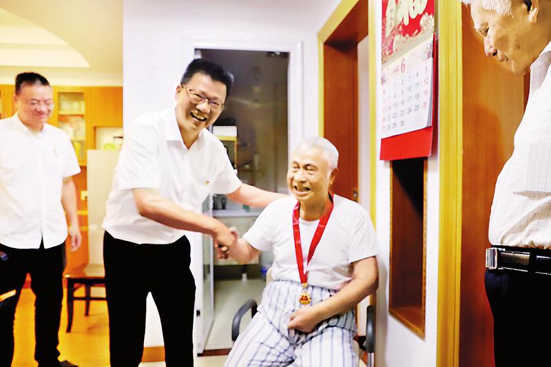 ④6月24日,福能物流公司黨委書記、董事長梁曉良為85歲的老黨員王惠芳頒發“光榮在黨50年”紀念章。