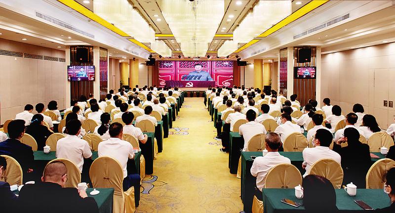 集團黨委組織本部全體員工、在榕權(quán)屬企業(yè)黨組織書記,在美倫飯店44樓展宏廳集中收看直播。(康維方攝)