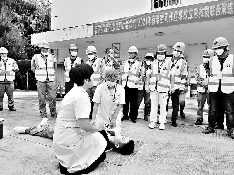 月30日上午,建材控股永定混凝土公司聯(lián)合當(dāng)?shù)卣_展應(yīng)急演練。該公司通過有限空間作業(yè)流程、心肺復(fù)蘇現(xiàn)場(chǎng)培訓(xùn),有效增強(qiáng)作業(yè)人員的安全意識(shí),提高作業(yè)人員的安全技能和應(yīng)急處置能力,為公司的安全穩(wěn)定奠定堅(jiān)實(shí)基礎(chǔ)。圖為醫(yī)護(hù)人員為職工演示心肺復(fù)蘇步驟和要點(diǎn)。