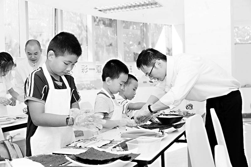 圖為暑托班小朋友正在上“美食DIY”課。 近日,筆者來到京閩酒店的“‘京’彩十悅”暑托班,只見十幾位小朋友正隨著兒歌做著韻律操。