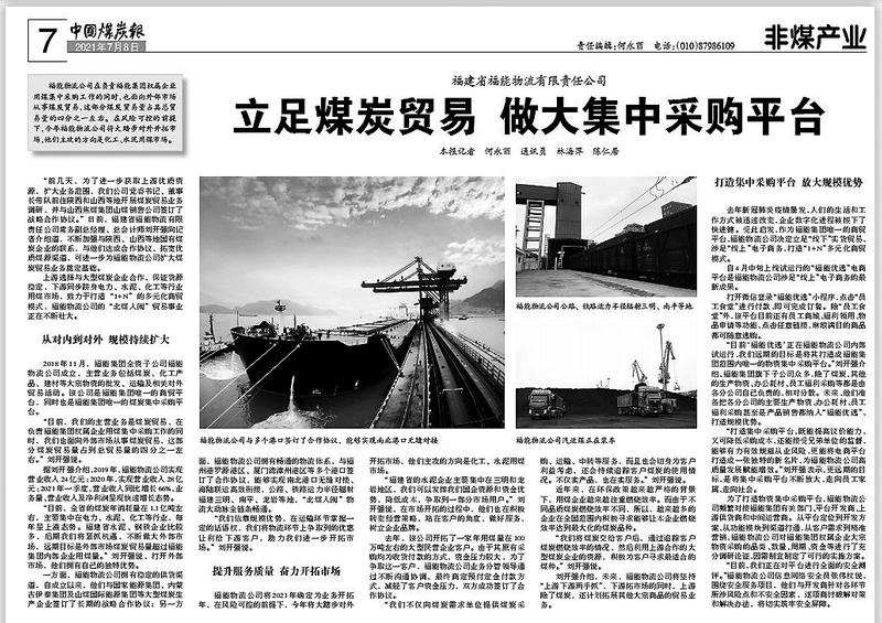 “前幾天,為了進(jìn)一步獲取上游優(yōu)質(zhì)資源,擴(kuò)大業(yè)務(wù)范圍,我們公司黨委書(shū)記、董事長(zhǎng)帶隊(duì)前往陜西和山西等地開(kāi)展煤炭貿(mào)易業(yè)務(wù)調(diào)研,并與山西焦煤集團(tuán)山煤銷(xiāo)售公司簽訂了戰(zhàn)略合作協(xié)議。日前,福建省福能物流有限責(zé)任公司常務(wù)副總經(jīng)理、總會(huì)計(jì)師劉開(kāi)強(qiáng)向記者介紹道,不斷加強(qiáng)與陜西、山西等地國(guó)有煤炭企業(yè)的聯(lián)系,與他們達(dá)成合作協(xié)議,拓寬優(yōu)質(zhì)煤源渠道,可進(jìn)一步為福能物流公司擴(kuò)大煤炭貿(mào)易業(yè)務(wù)奠定基礎(chǔ)。
