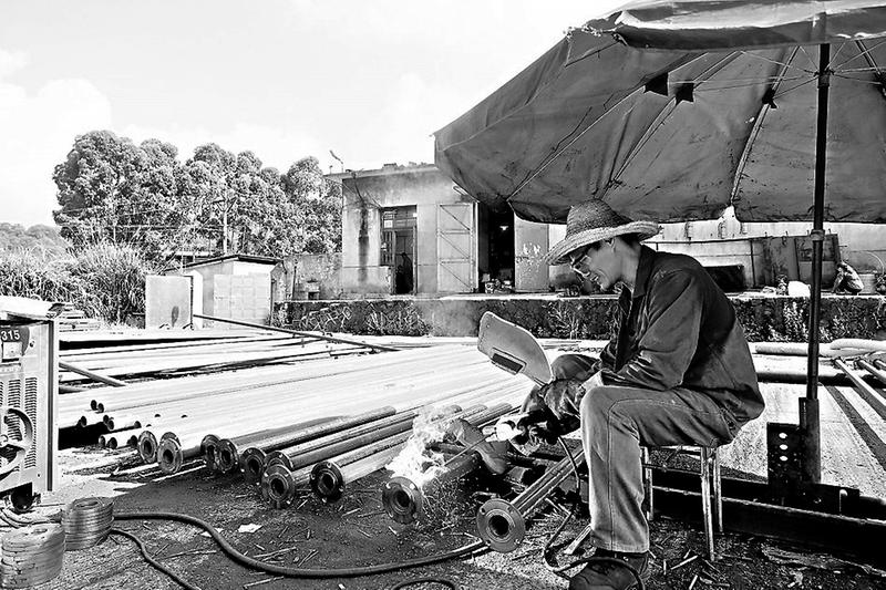 近日,在福建煤電公司龍?zhí)睹旱V機修車間門口的廣場上,電焊工張師傅正在遮陽傘下焊接風水管法蘭。