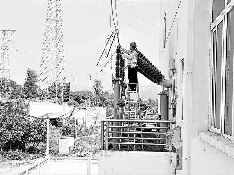 7月27日,福能新能源公司后海風(fēng)電場110kV升壓站2021年度檢修工作拉開序幕。圖為近日,檢修員在烈日下清潔緊固110kV后海線避雷器。