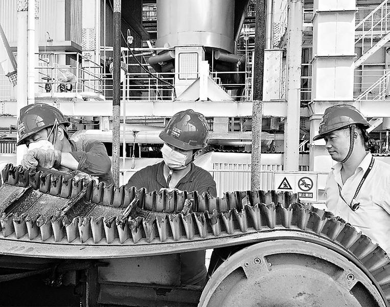此次更換大傾角皮帶的工作,時(shí)間緊、任務(wù)重,既要按照既定方案完成對(duì)皮帶的安裝,又要確保能夠順利排渣,維持#1、#2鍋爐爐膛床壓的穩(wěn)定。該公司設(shè)備部鍋爐點(diǎn)檢長洪國泰拿著對(duì)講機(jī)井然有序地指揮著工作:“吊車起吊防護(hù)罩要注意防護(hù)罩的連接位置,防止其掉落造成高空墜物,起吊時(shí)注意疏散附近施工及過路的人員……”設(shè)備部鍋爐專業(yè)及外委人員全員上陣,點(diǎn)檢長、點(diǎn)檢工程師負(fù)責(zé)現(xiàn)場調(diào)度和指揮以及對(duì)施工安全交底、安全盯守等,外委機(jī)務(wù)班組成員負(fù)責(zé)防護(hù)罩、托輥及大傾角皮帶的拆卸和回裝,綜合班組成員負(fù)責(zé)輪流手動(dòng)排渣及放渣清理工作。