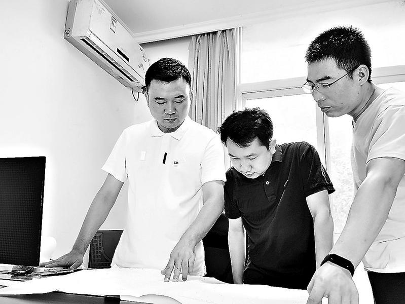 圖為楊文杰(左一)正在與技術(shù)人員交流工作