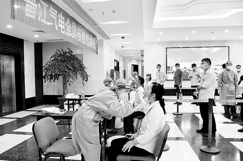 針對(duì)國(guó)慶期間人員流動(dòng)性大,接觸情況較為復(fù)雜的情況,10月12日,晉江氣電公司協(xié)調(diào)當(dāng)?shù)胤酪咿k,安排醫(yī)護(hù)人員到公司進(jìn)行全員核酸檢測(cè),公司全體員工及外委隊(duì)伍人員參加檢測(cè)。(吳傳強(qiáng)攝影報(bào)道)