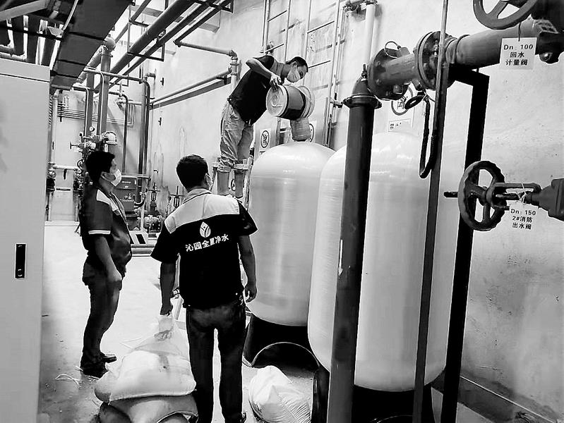 近日,福能新能源公司后勤管理中心通過(guò)詢價(jià)招標(biāo)的方式,在后勤基地生活水箱前端安裝凈水設(shè)備,以提高飲用水品質(zhì)。圖為員工對(duì)安裝后的凈水設(shè)備進(jìn)行材料加注。(陳富彬 肖葆 攝影報(bào)道)