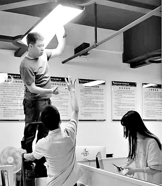 近日,福安美倫地產(chǎn)公司收到職工們反映辦公室燈光太暗的問(wèn)題后,隨即將其納入“我為群眾辦實(shí)事”問(wèn)題清單。該公司辦公室立即定制采購(gòu)并替換安裝了一批LED白光照明燈。圖為該公司職工合作安裝遮光燈罩。