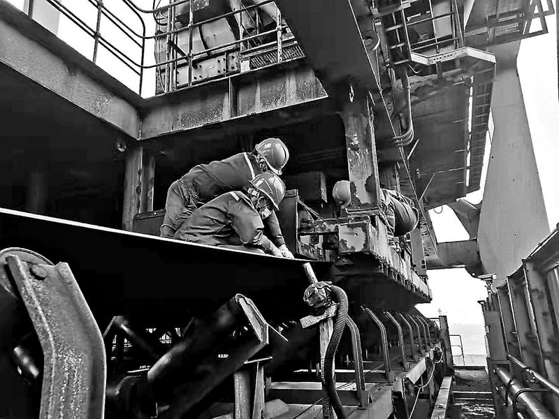 為做好能源保供工作,保障卸煤系統(tǒng)的安全穩(wěn)定運(yùn)行,鴻山熱電公司利用卸煤空檔期組織人員完成#3卸船機(jī)料斗焊補(bǔ)、大車#7減速機(jī)漏油處理等工作,為卸煤設(shè)備“充電蓄能”。圖為10月23日,該公司燃料人員正在更換#3卸船機(jī)防溢裙板。(朱日昕 攝影報(bào)道)