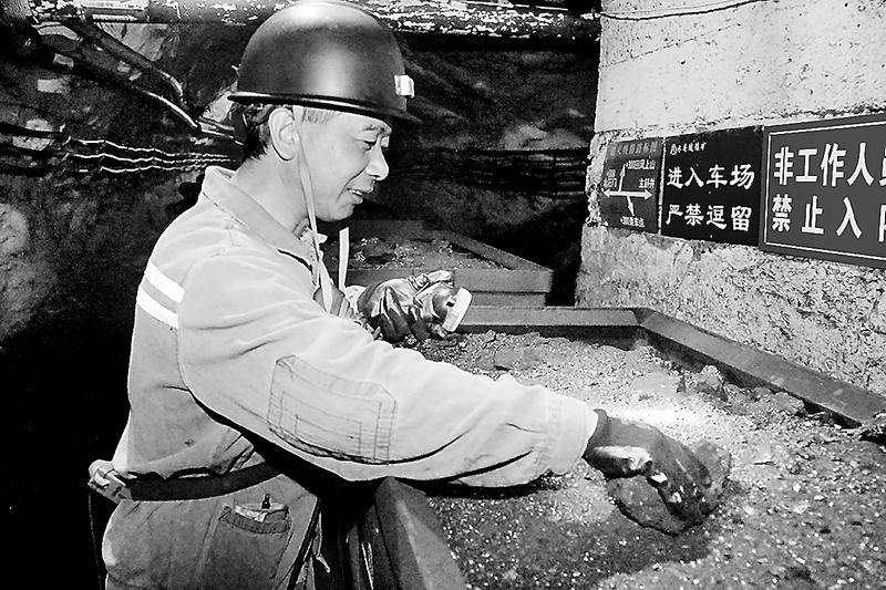 (鄒超男 攝影報(bào)道)圖為江振來(lái)在工作面查看煤質(zhì)煤量