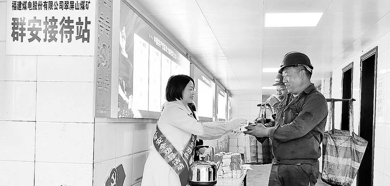 為做好秋冬安全生產(chǎn)工作,福建煤電公司翠屏山煤礦女工委開展“送溫暖”活動。圖為12月1日,該礦女工在井口親情服務(wù)站為出入井的礦工兄弟送上暖心姜茶,并囑咐他們要按章操作,安全生產(chǎn)。(溫曉蘭 攝影報(bào)道)