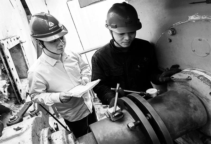 晉南熱電公司#3鍋爐引風(fēng)機軸承異常振動,12月3日,設(shè)備部員工利用下班時間一起交流聯(lián)軸器找中心的心得。圖為公司員工正在維修機器。(林國新傅安強攝影報道)