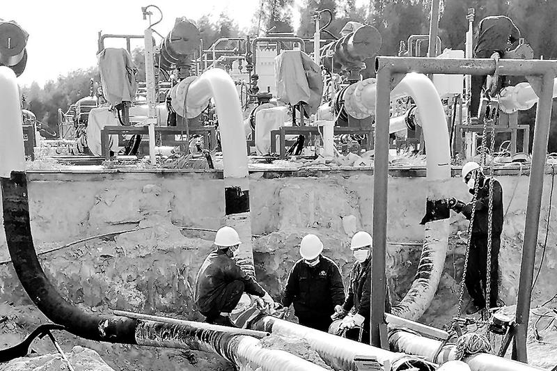 (王素環(huán)攝影報(bào)道)圖為檢修人員正在進(jìn)行天然氣地埋管道焊口環(huán)切工作。