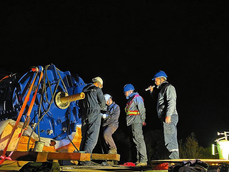 經(jīng)協(xié)商達成一致意見與統(tǒng)籌安排后,高空設(shè)備更換廠家作業(yè)人員于1月12日上午入場,他們放棄午休時間,在該公司安全管理人員盯守現(xiàn)場保障整個過程安全作業(yè)下,從13時施工作業(yè)至22時;1月13日5時30分,天還未亮就動工,連續(xù)作業(yè)至16時,風機齒輪箱備件吊裝全部完成。隨后,吊車轉(zhuǎn)場至大蚶山#2風機平場地,1月14日組裝吊車各環(huán)節(jié)設(shè)備,做好前期工作準備,并于1月15日順利完成#2風機齒輪箱吊裝。