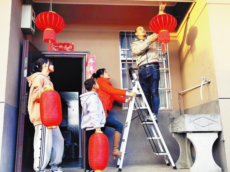 春節(jié)前夕,永安煤業(yè)仙亭煤礦處處洋溢著節(jié)日的喜慶氣氛。留礦過(guò)年的職工家屬們買年貨、貼對(duì)聯(lián)、掛燈籠。圖為該礦安全幸福家庭吳以柑、朱美容夫婦在家門口掛燈籠迎新年。(薛文勇攝影報(bào)道)
