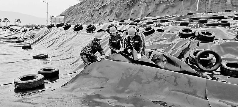 復工伊始,寧德突發(fā)短時強降雨,瞬時風力達9~10級,福化環(huán)保公司寧德子公司立即啟動應急預案,由青年黨員帶頭上陣,冒著風雨,加固覆蓋膜、抽排積水。經(jīng)過應急處理,該公司填埋場排水溝渠暢通,順利復工復產(chǎn)。圖為該公司員工正在加固覆蓋膜。(福化環(huán)保攝影報道)